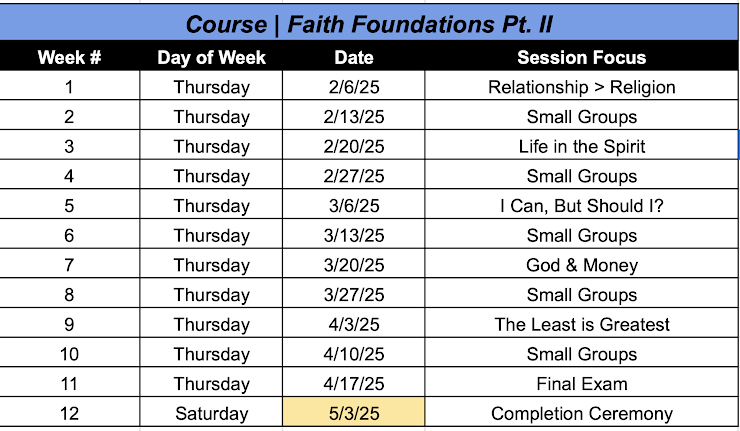 Faith Foundations Pt II is Evolve's Discipleship Course further unpacking the identity of a believer in Christ. Over the span of 12 weeks, participants are immersed deeper into God's word, challenging the way the see the world, God, and themselves while also building community with other believers through small groups. Following the final exam in week 11, a completion ceremony will be held the following Saturday.